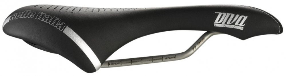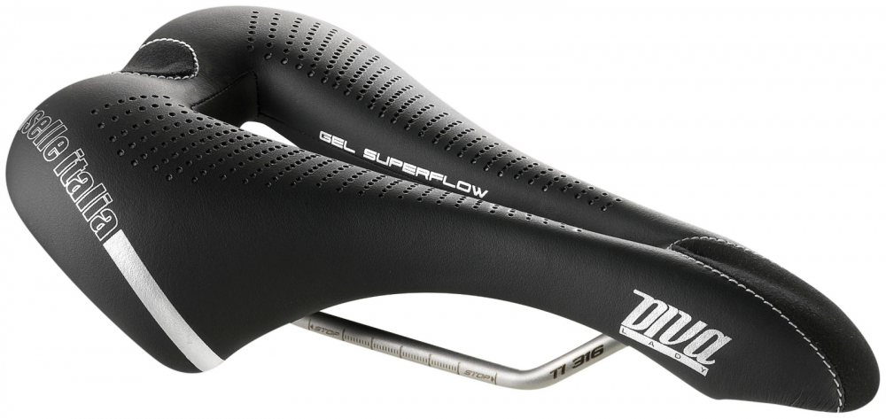 Mit Diva lanciert Selle Italia einen Frauensattel im Zeichen des Stils. Sportlichkeit und ein sehr schönes Design sind seine Kennzeichen. In seiner Linienführung liegt die Entschlossenheit der beharrlichsten Leistungssportlerinnen und Radbegeisterten. Der spezielle anatomische Gel-Superflow-Ausschnitt bietet exzellenten Komfort für „Weichgewebe”-Bereiche durch mehr Flexibilität an der Vorderseite des Sattels. In Kombination mit einer dünnen Schicht Silikongel werden so die Straßenvibrationen absorbiert. Der Bezug ist aus Fibra-Tek, einer Funktionsmikrofaser, die einen beständigen und leichten Sattel bereitstellt, der sich auch für lange Strecken eignet.