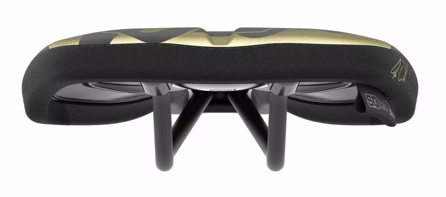 Der 611 ERGOWAVE® Fabio Wibmer kommt im schwarz/goldenen Design und sorgt durch seine wellenartige Form und das hochgezogene Heck für den perfekten Halt nach hinten und eine optimale Druckverteilung bis in die tiefen Strukturen des Körpers, wodurch die Kraftübertragung auf das Pedal wesentlich verbessert wird. Die tieferliegende Sattelnase schafft, in Kombination mit der Vertiefung in der Mitte, mehr Platz und Freiraum für den Dammbereich. Auch das Polstermaterial wurde auf die Anforderungen des MTB angepasst und verfügt über mehr Dämpfung im ruppigen Gelände. Hochwertiger Kevlarbezug schützt die besonders beanspruchten Stellen am Sattel. Das Plus an Stabilität bieten die zusätzlich verstärkten Sattelstreben.